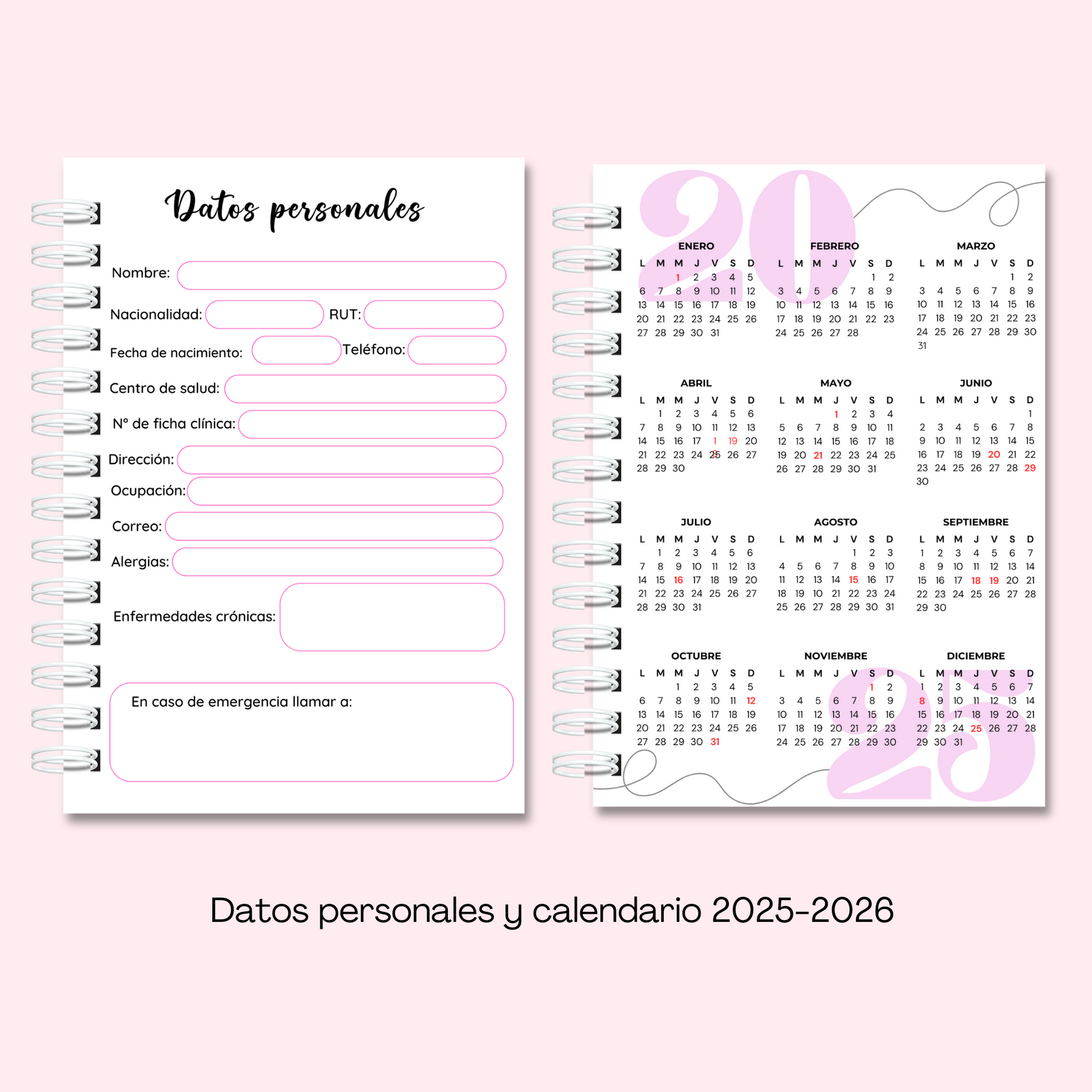 Es de tamaño A5 (14.8 x 21 cm) con 100 hojas de 105 grs, incluye elástico, set de stickers y portada personalizada, contiene además: